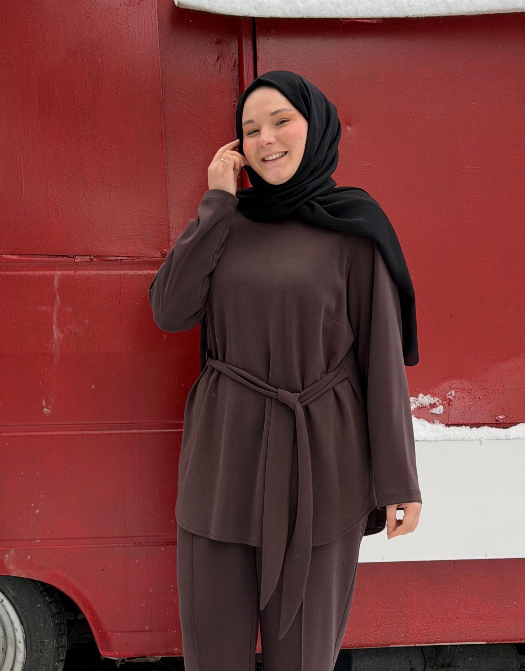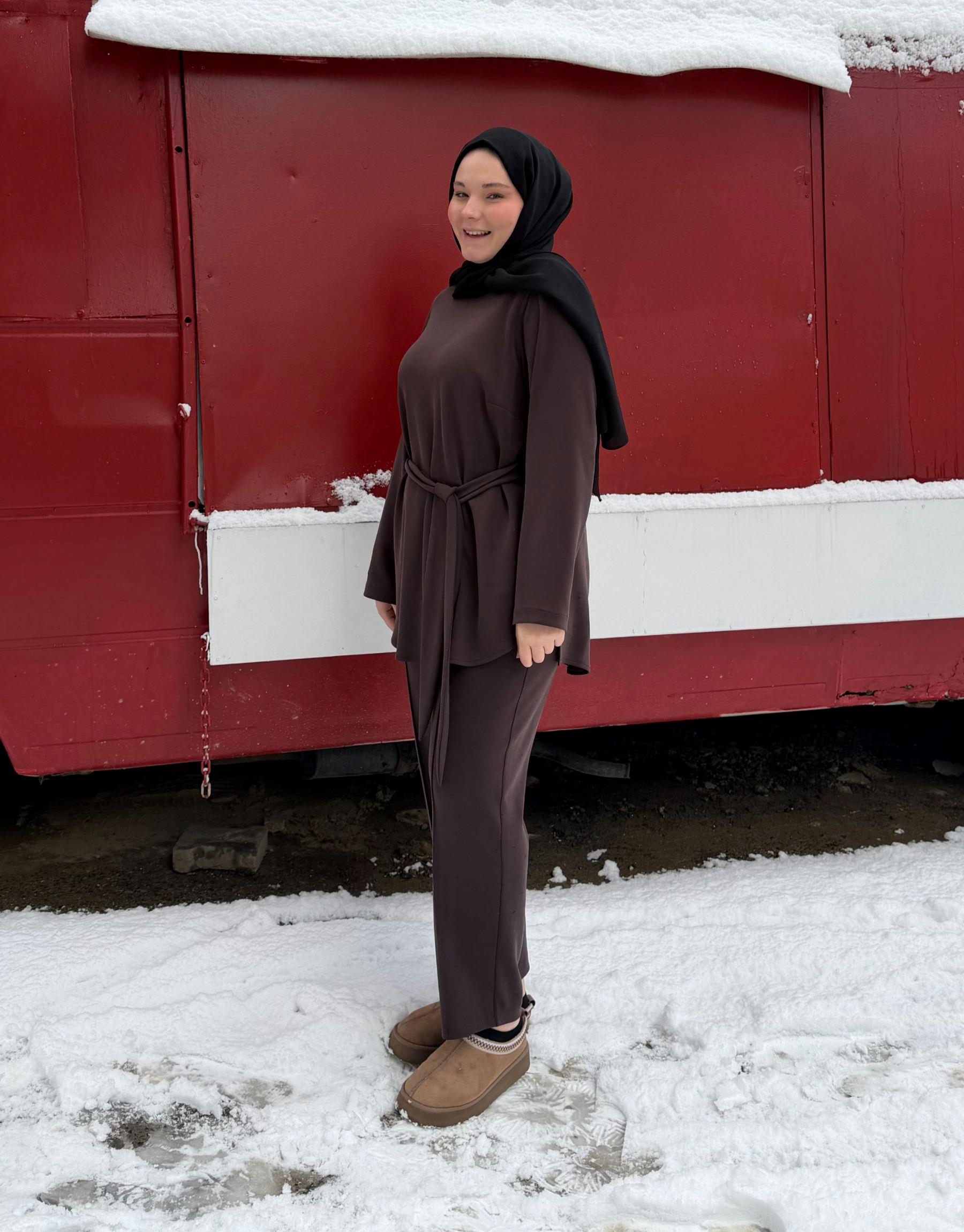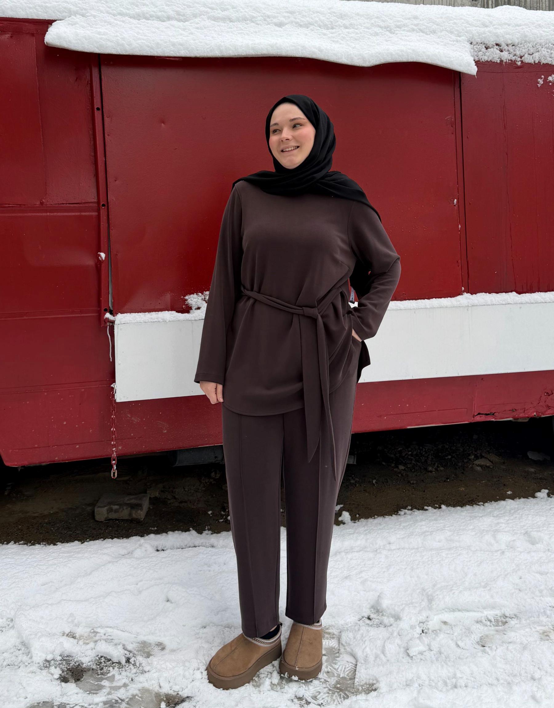 Bayan Acı Kahve Modal Kuşak Detaylı Takım | Sarprive