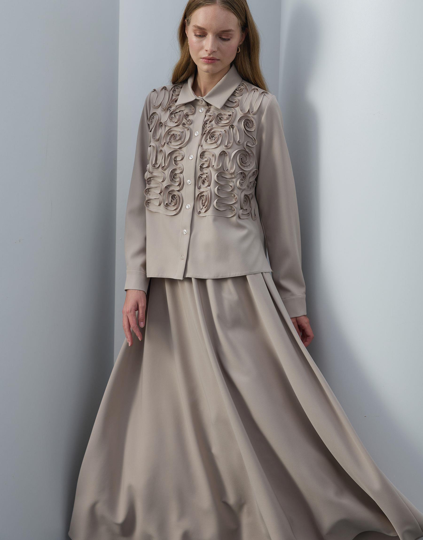 Bayan Bej Nakış Detaylı Etekli Takım | Sarprive