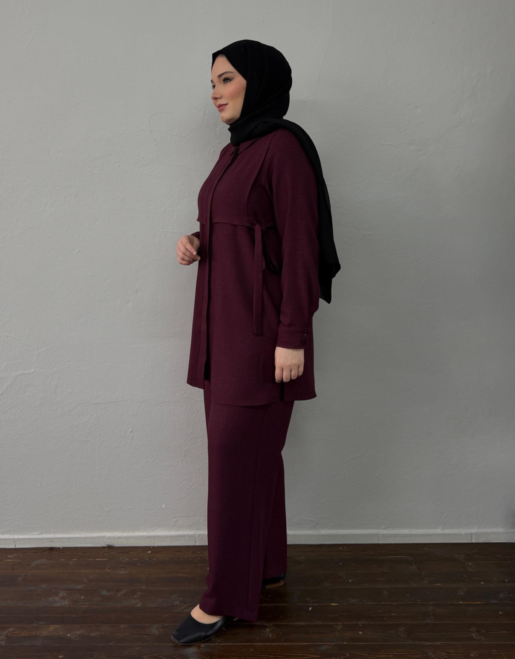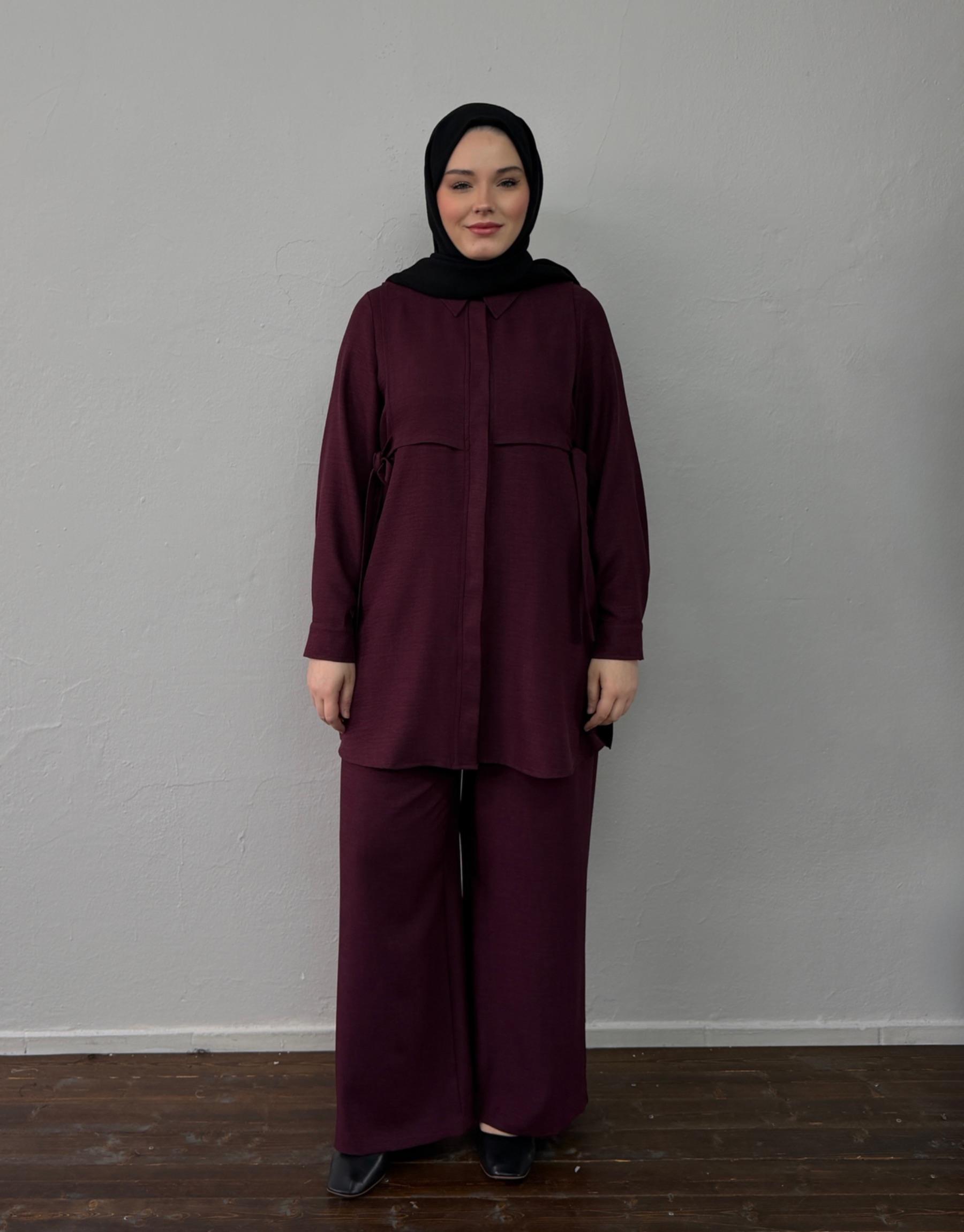 Bayan Bordo Keten Dokulu Bağlama Detaylı Takım | Sarprive