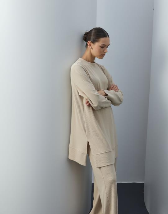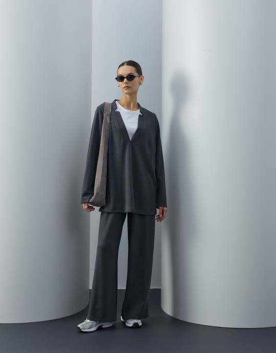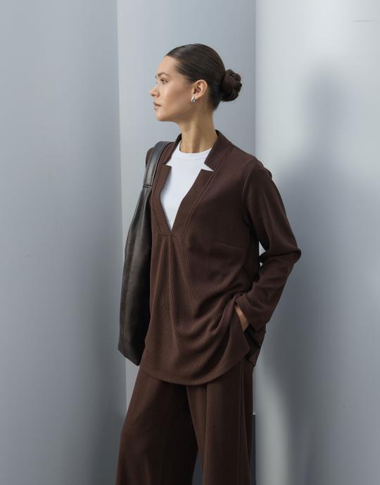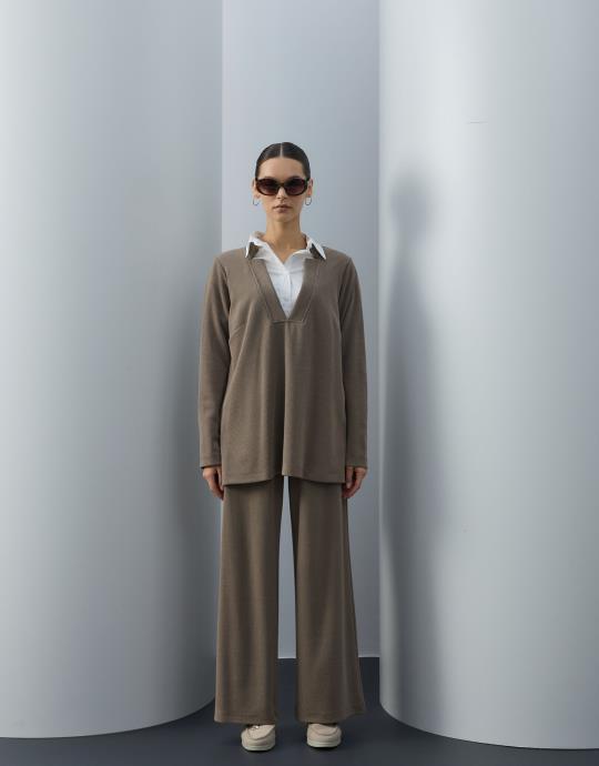 Acı Kahve Triko V Yaka Bol Formlu Takım