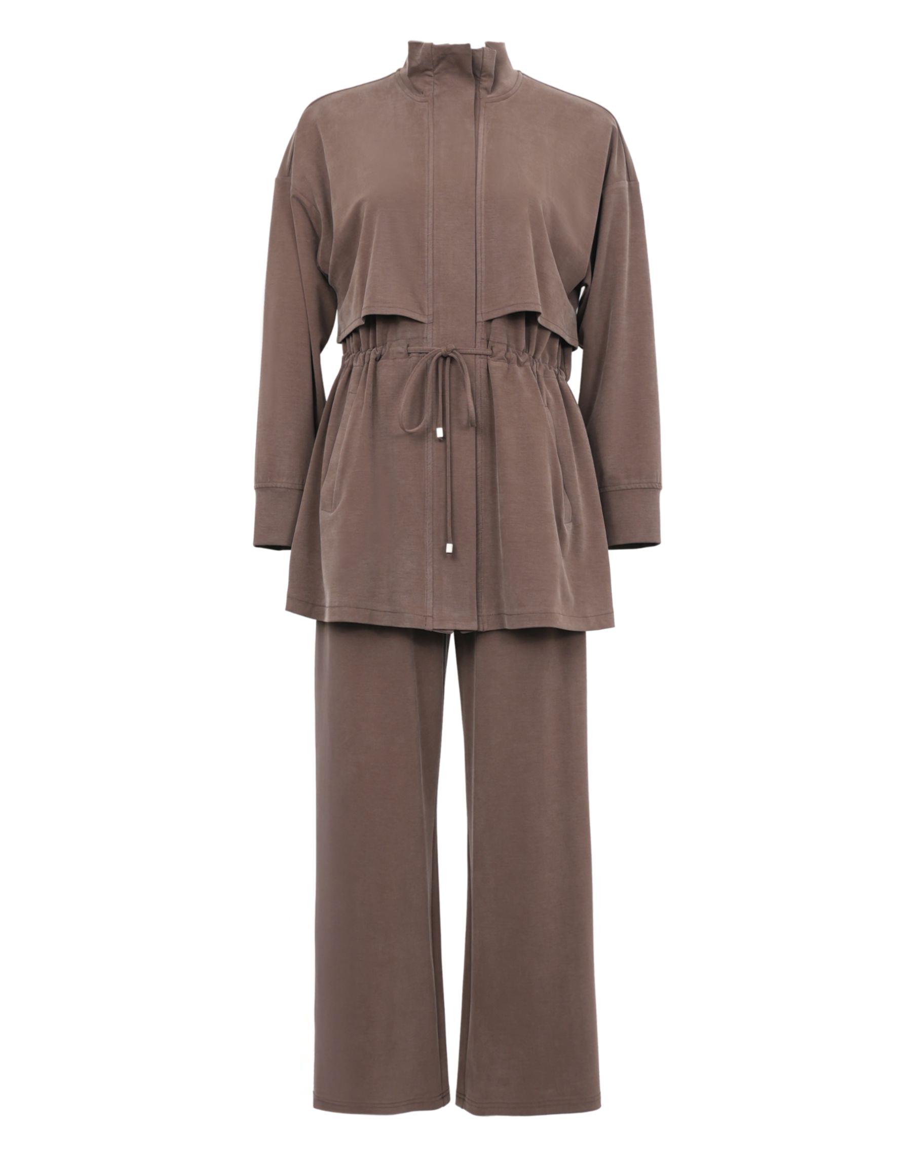Ürün bilgisi: Yumuşak dokulu örme kumaşı ve bağcık detaylarıyla tasarlanan bu takım, konforlu şıklığı modern bir stil ile buluşturur. Akışkan formu sayesinde gün boyu rahat bir kullanım sunarken, bağcık detayı tasarıma hareketli ve özgün bir dokunuş kazandırır.