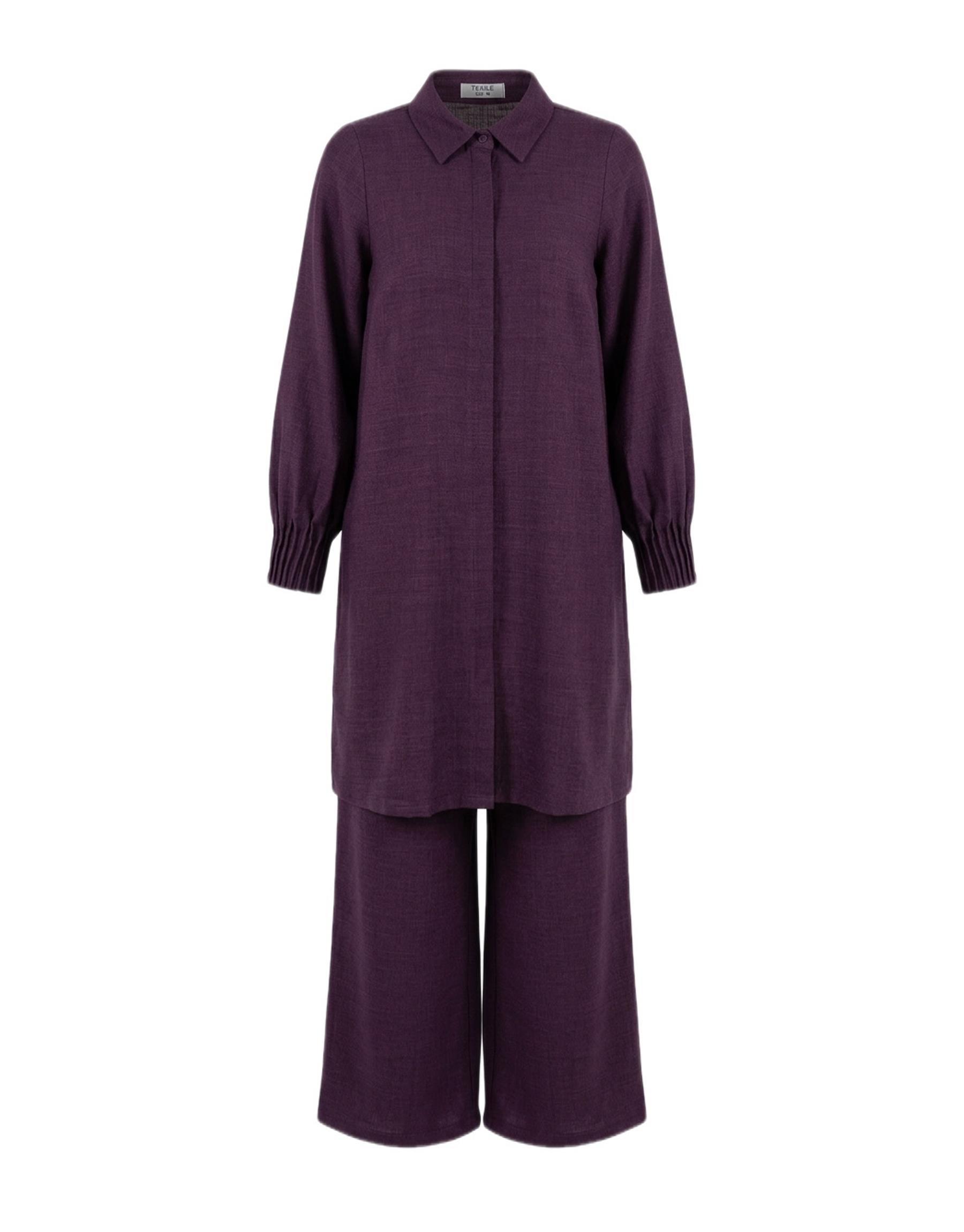Bayan Mürdüm Mimoza Keten Dokulu Nervür Detaylı Takım | Sarprive