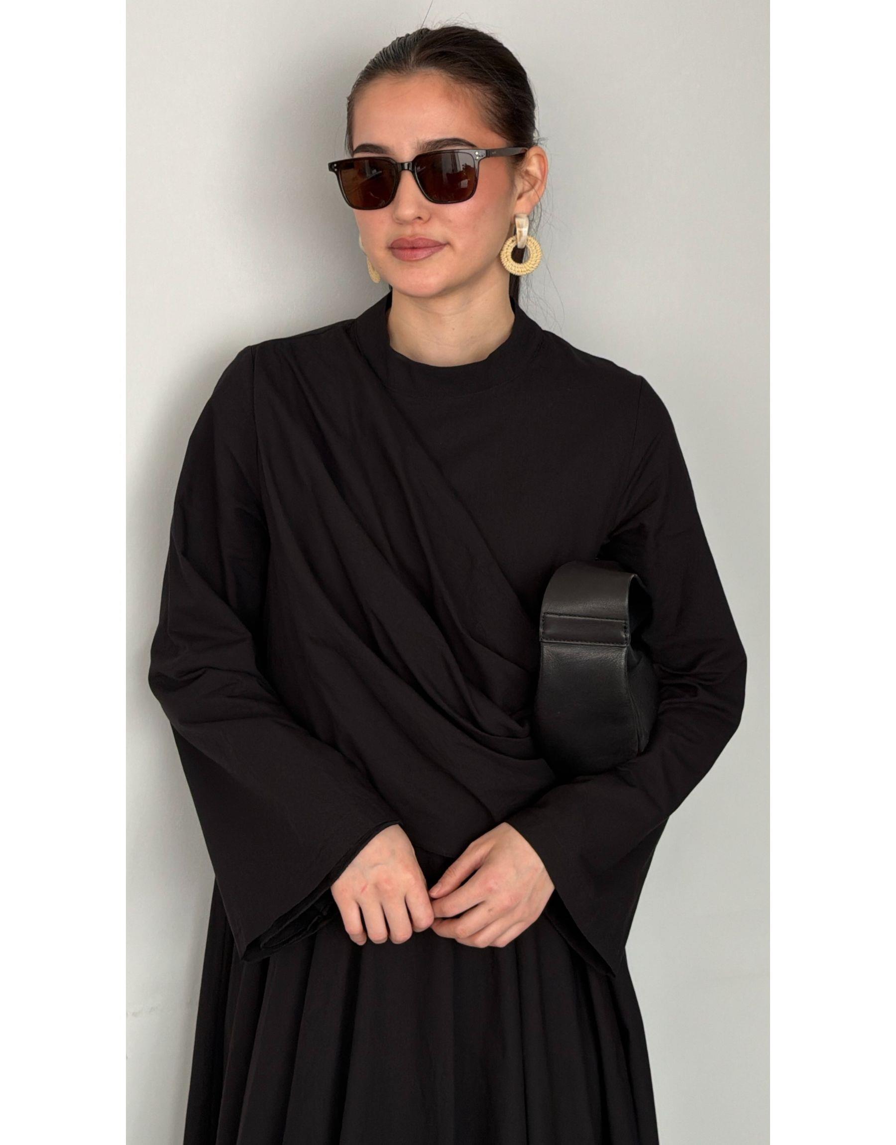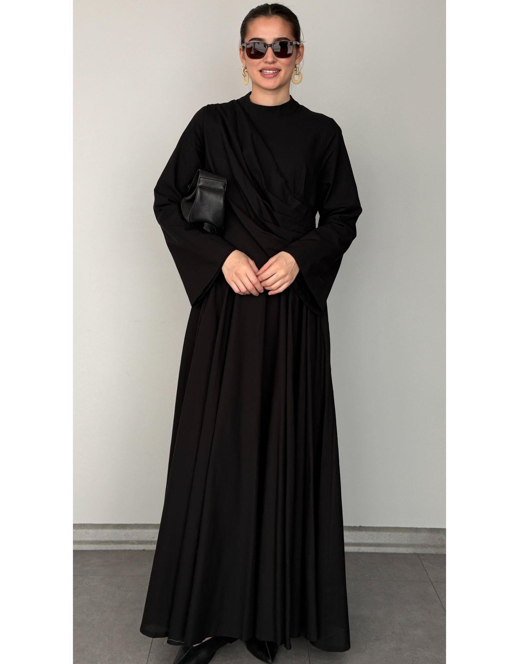 Siyah Pamuklu Pile Detaylı Elbise