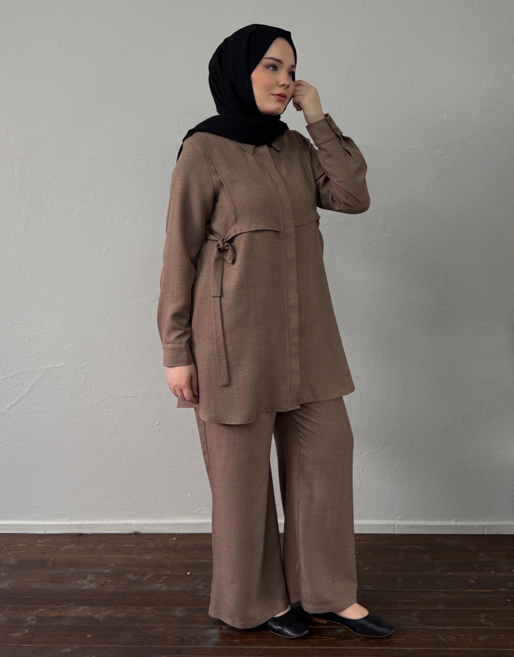 Bayan Sütlü Kahve Keten Dokulu Bağlama Detaylı Takım | Sarprive
