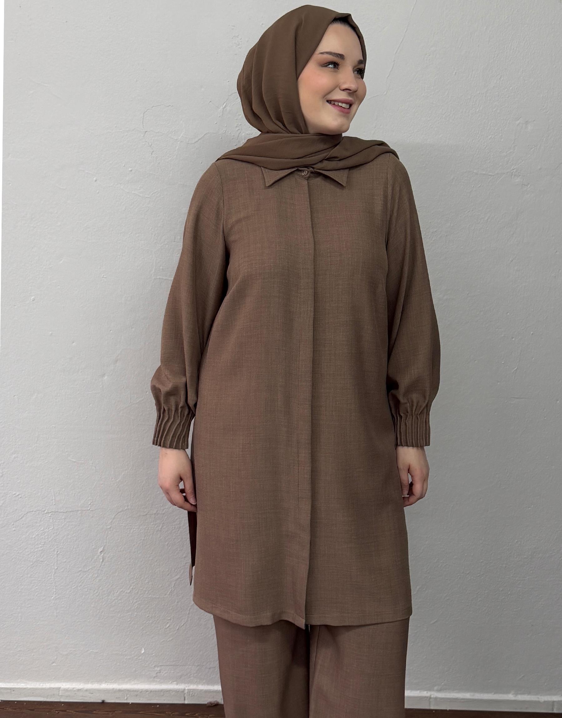 Bayan Sütlü Kahve Mimoza Keten Dokulu Nervür Detaylı Takım | Sarprive