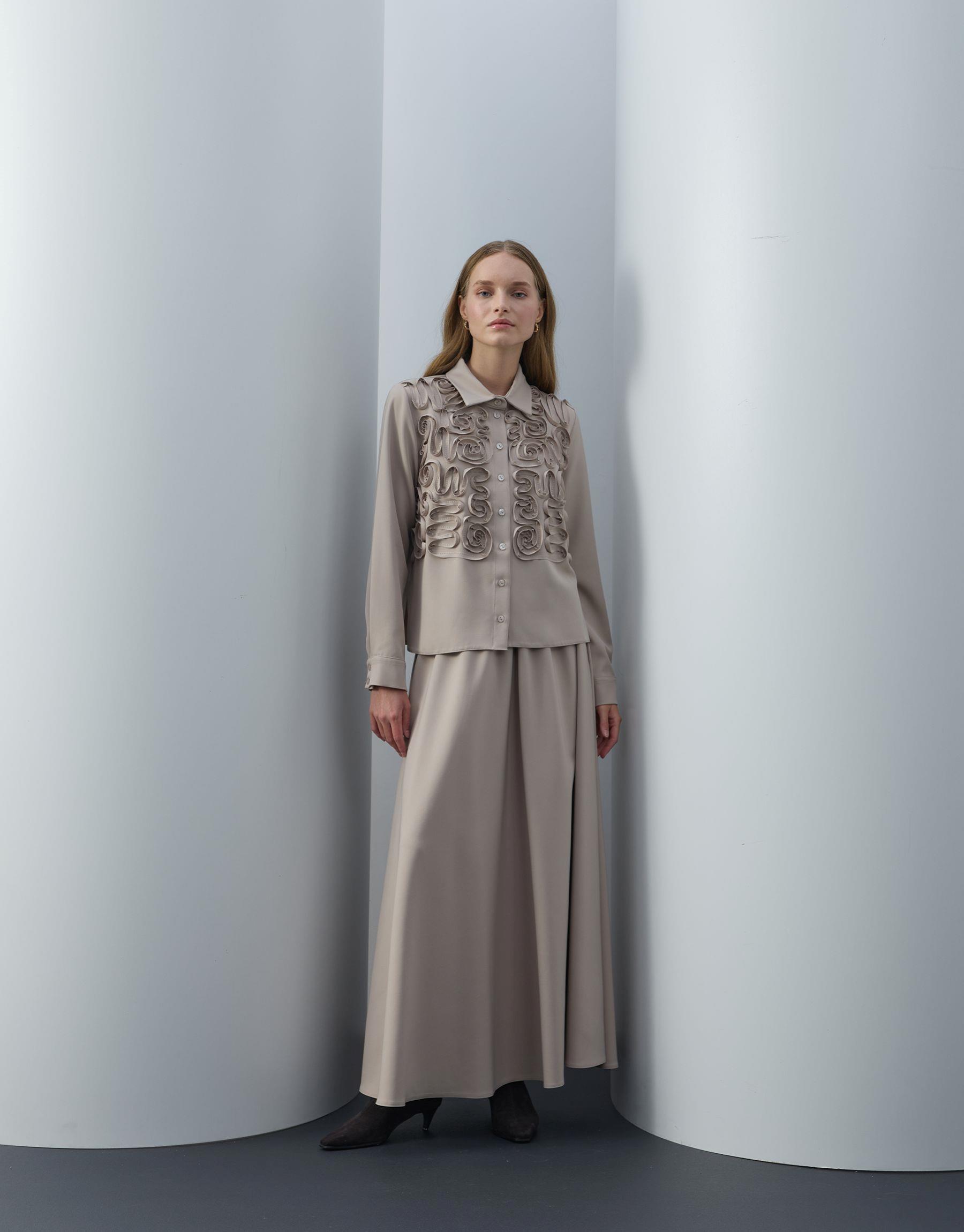 Bayan Bej Nakış Detaylı Etekli Takım | Sarprive