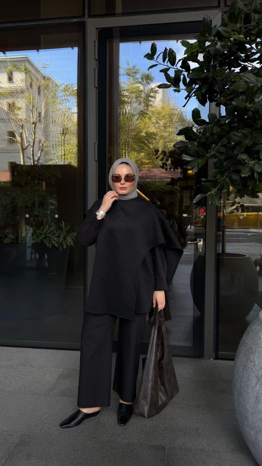 Siyah Yün Karışımlı Panço