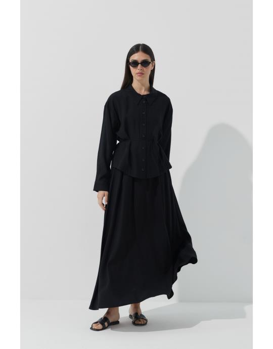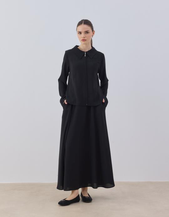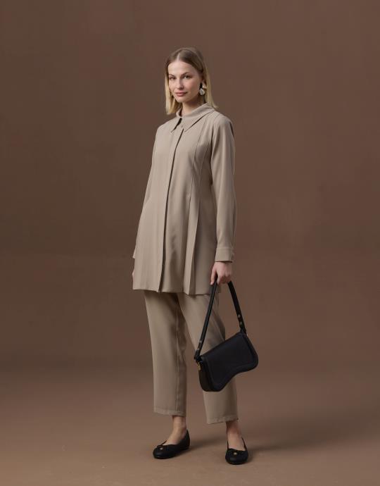 Erkek yaka tasarımıyla klasik çizgileri yeniden yorumlayan tunik, ön kısmındaki gizli pat detayıyla sade ve zarif bir görünüm sunar. Bel kısmı düğmeli köprü ile hareketlendirilerek vücut formunu zarifçe ortaya çıkarır. Düz manşetli kolları, tunik formuna yalın ama güçlü bir ifade kazandırır.