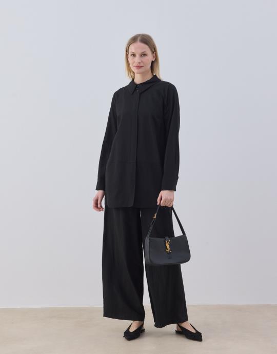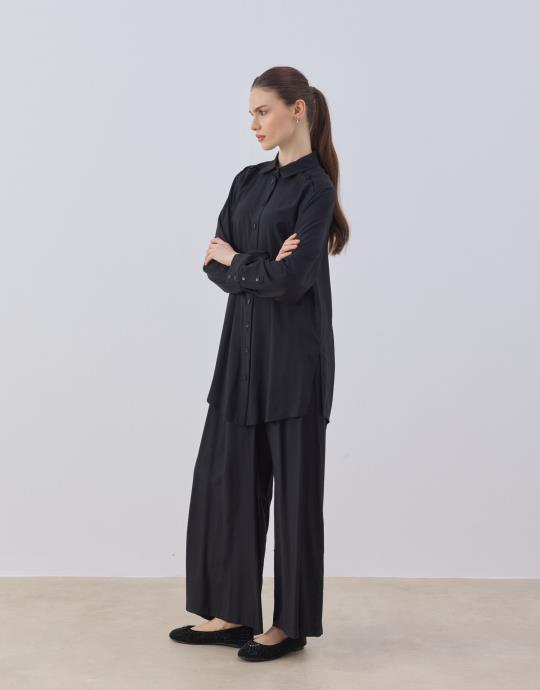 Bol kesimiyle rahat ve şık bir siluet yaratan pantolon, takımın dinamik duruşunu tamamlar. Gün boyu konfor sağlarken, uzun paçaları ve dökümlü yapısıyla topuklularla birleştiğinde zarif bir uzama etkisi yaratır.